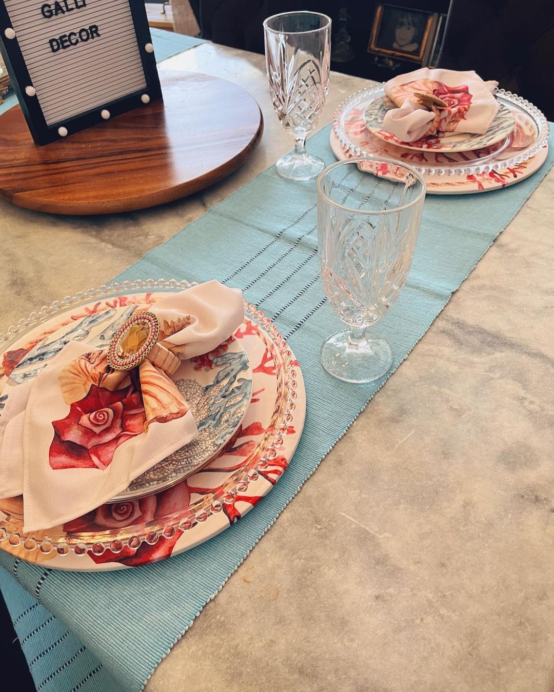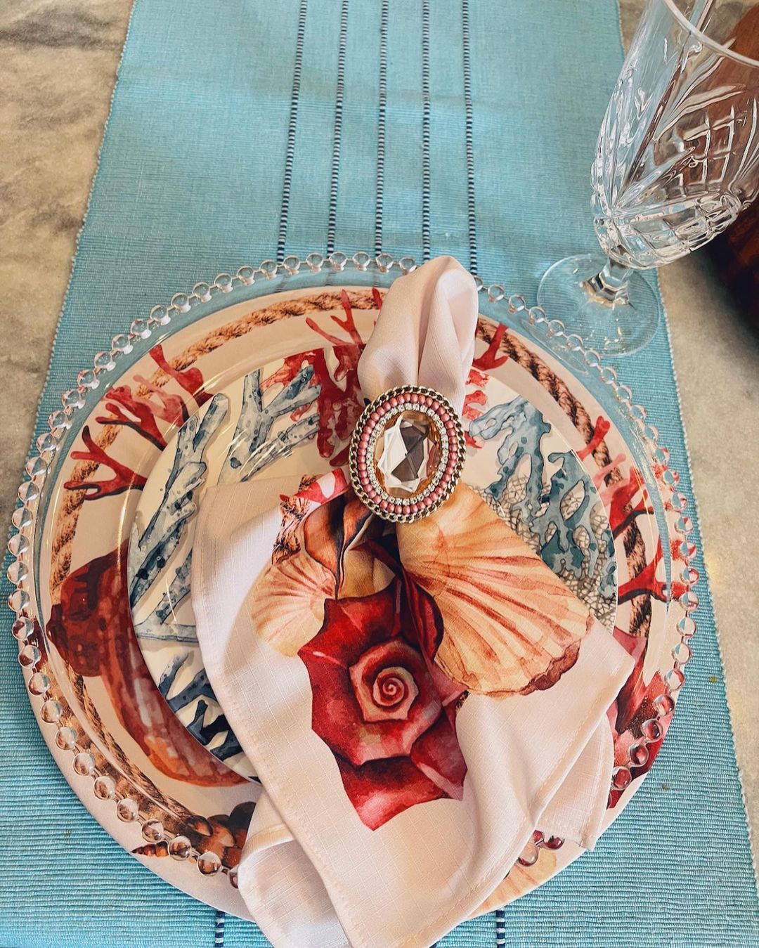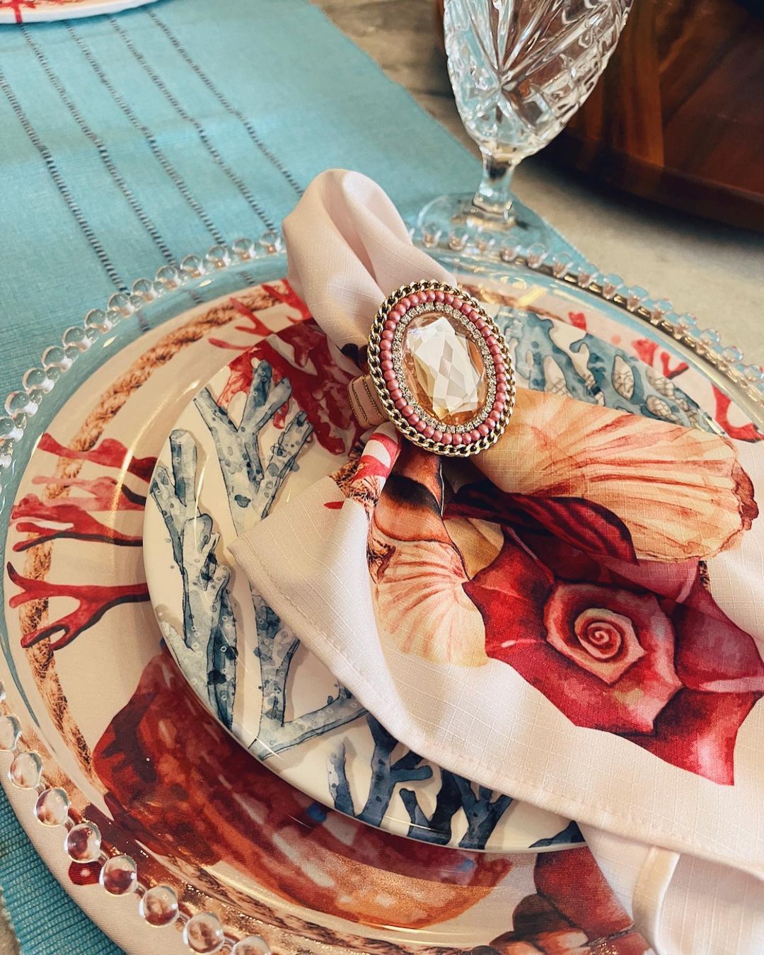 Set contains: one sousplat cover, one napkin, and one napkin ring as per in the picture.