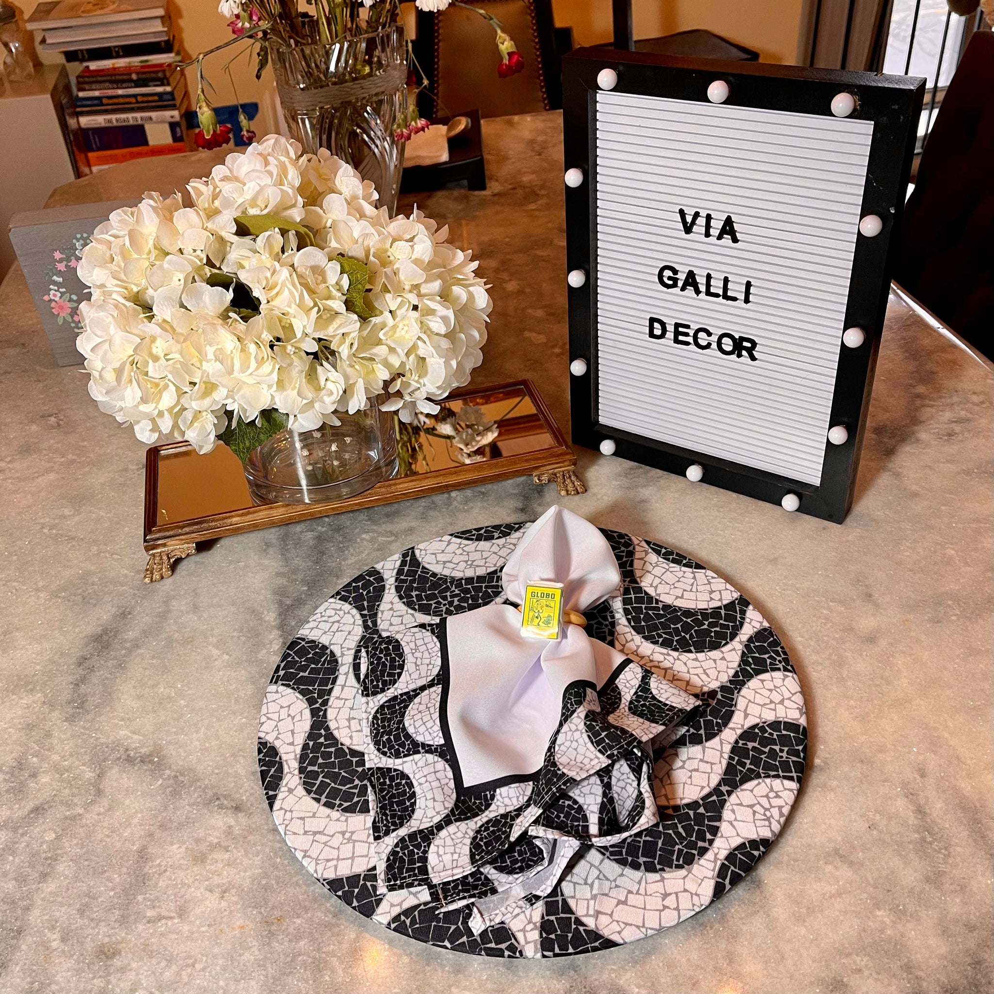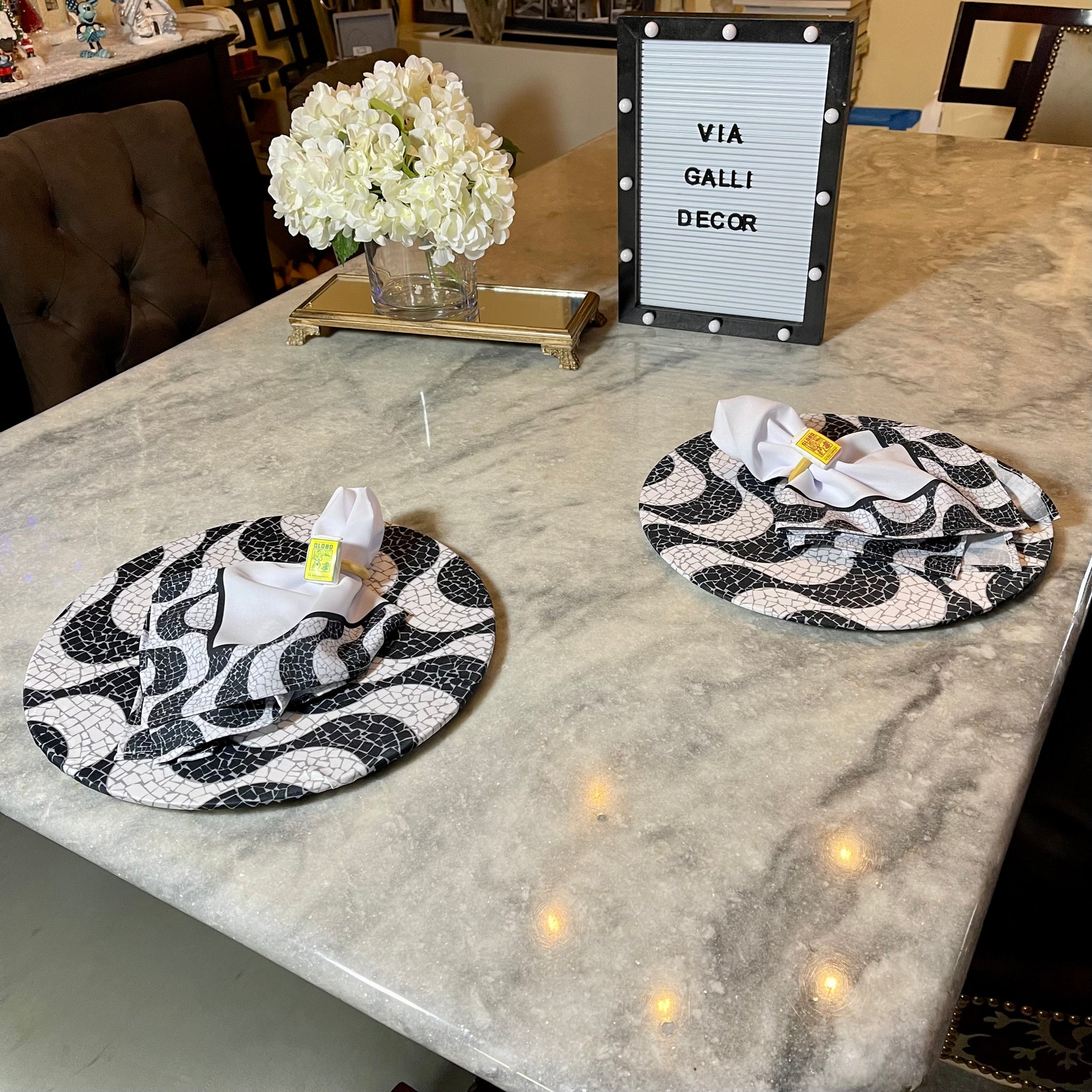 Set contains: one sousplat cover, one napkin, and one napkin ring as per in the picture.