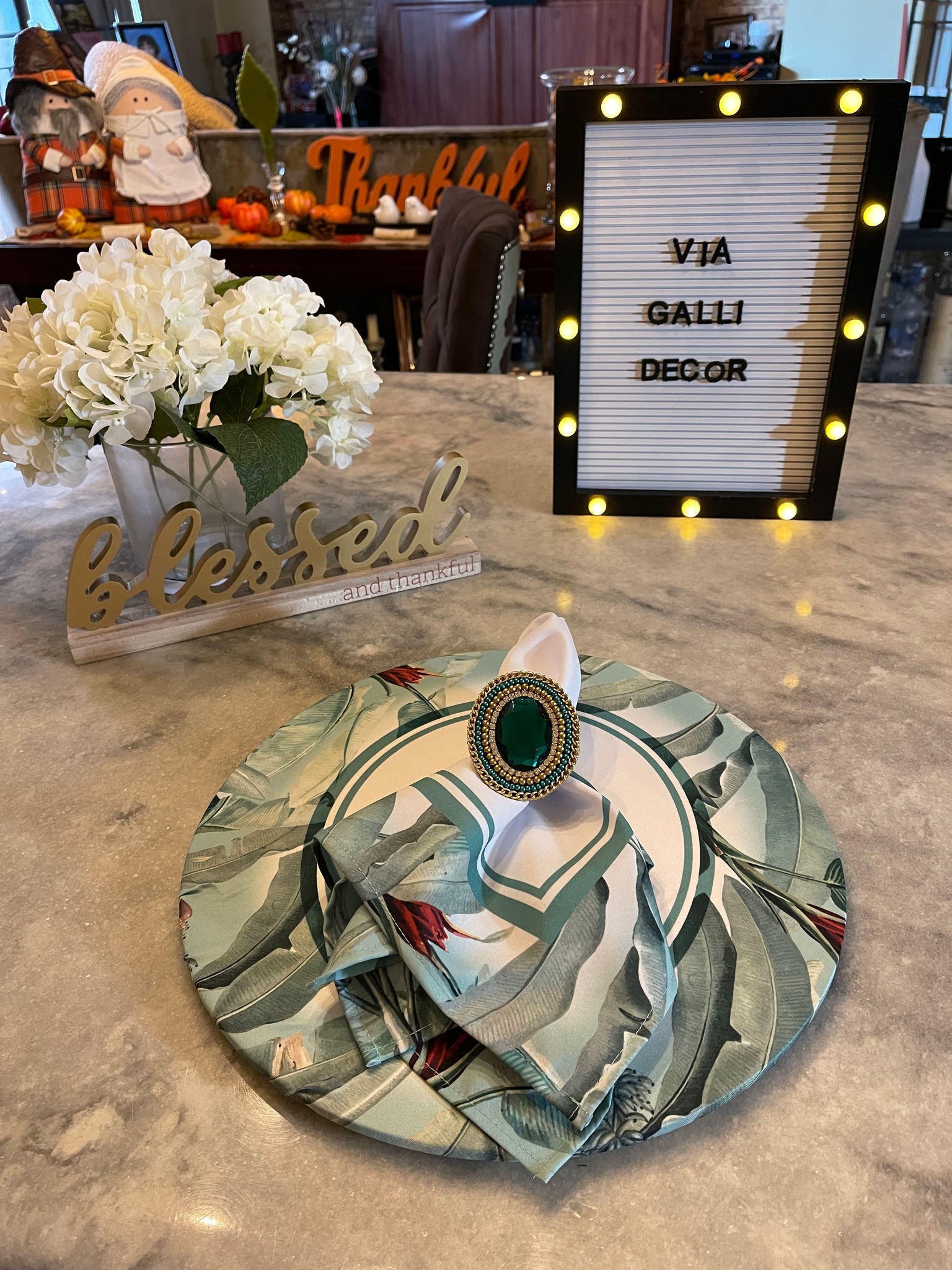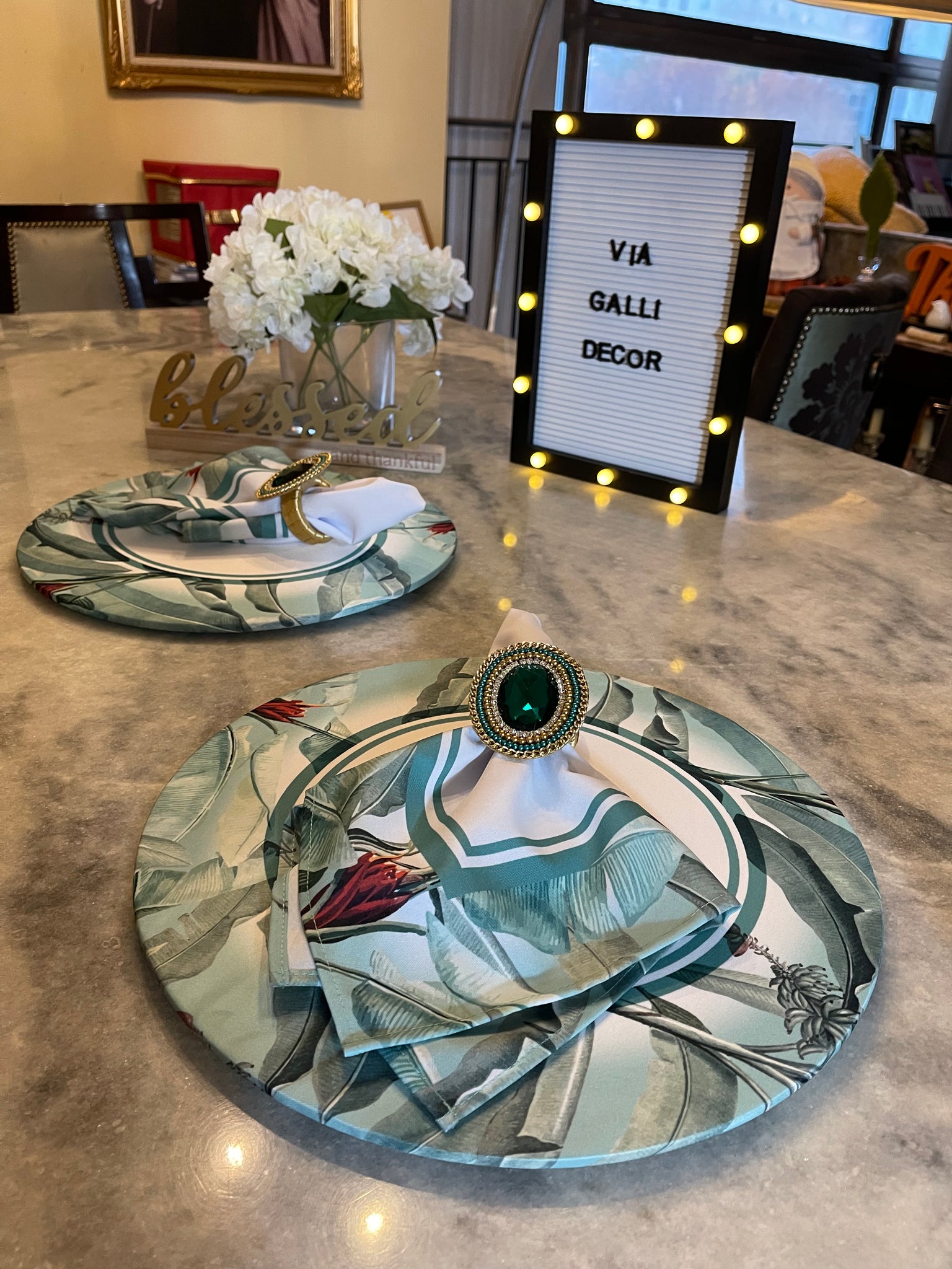 Set contains: one sousplat cover, one napkin, and one napkin ring as per in the picture.