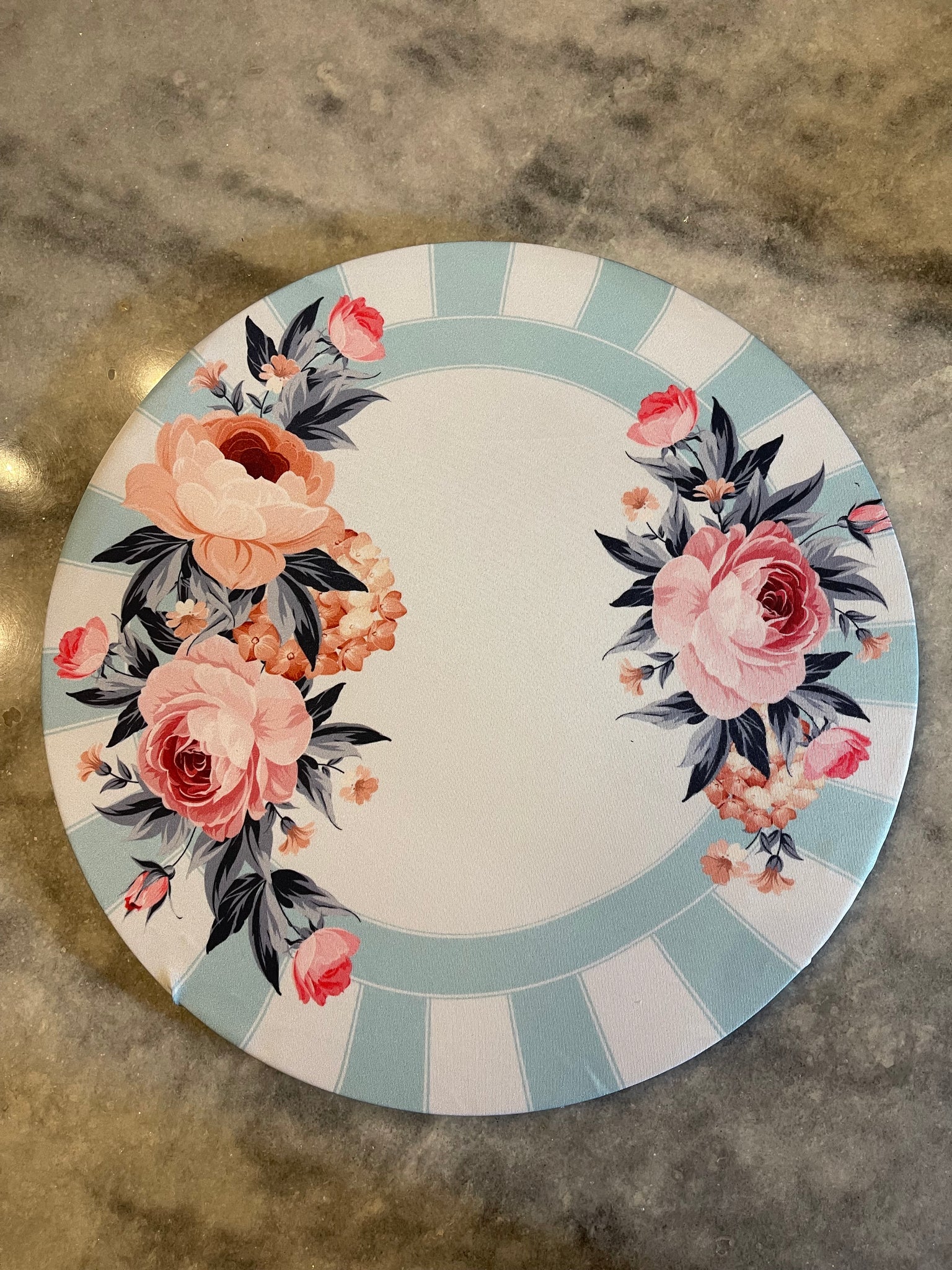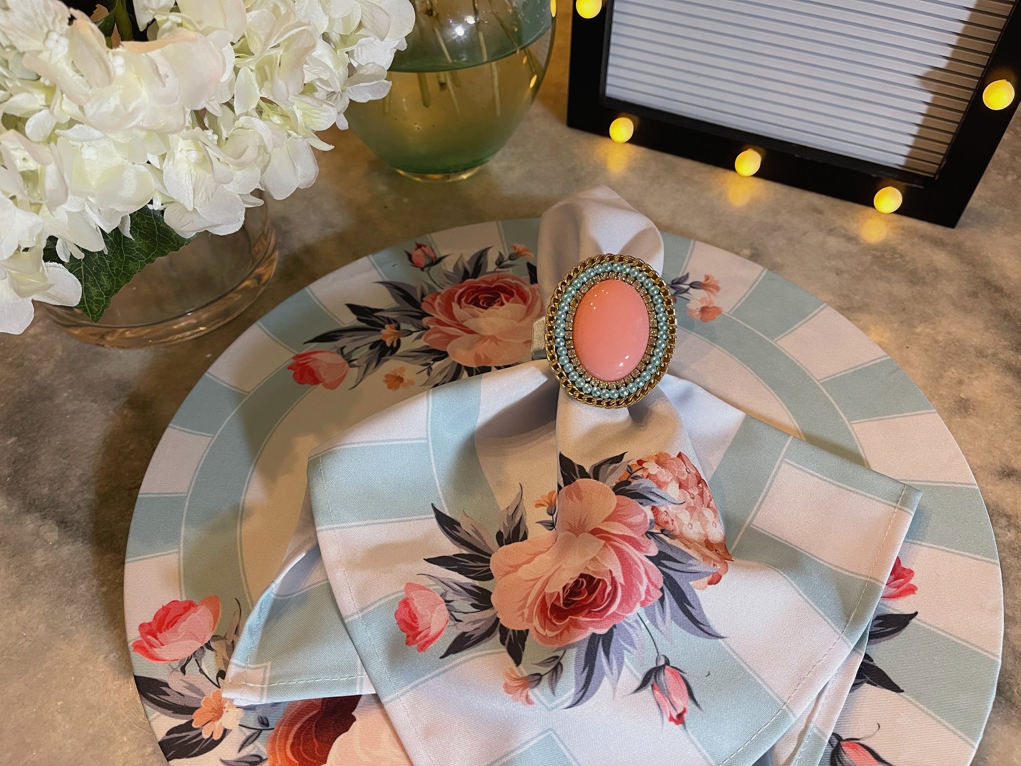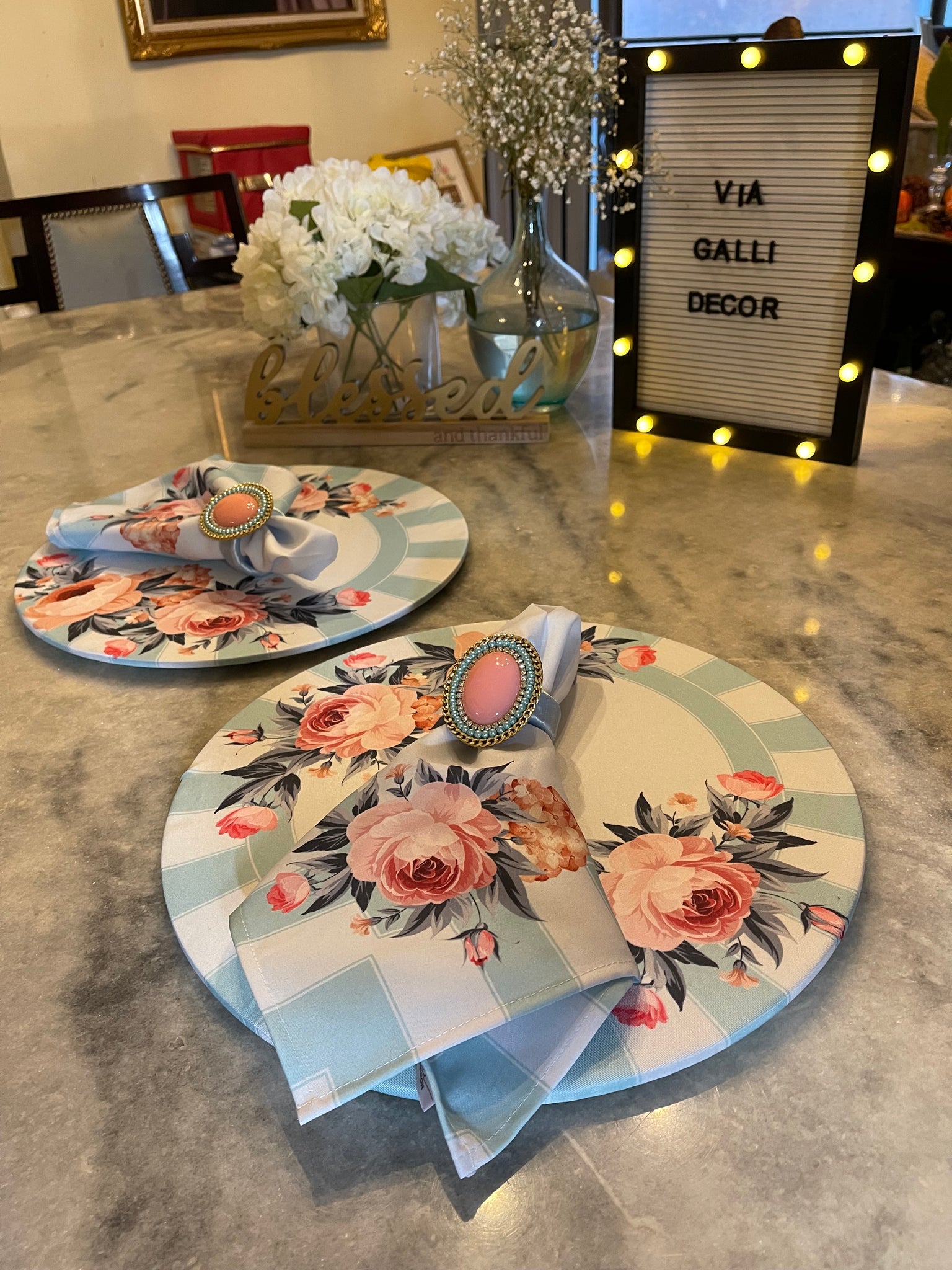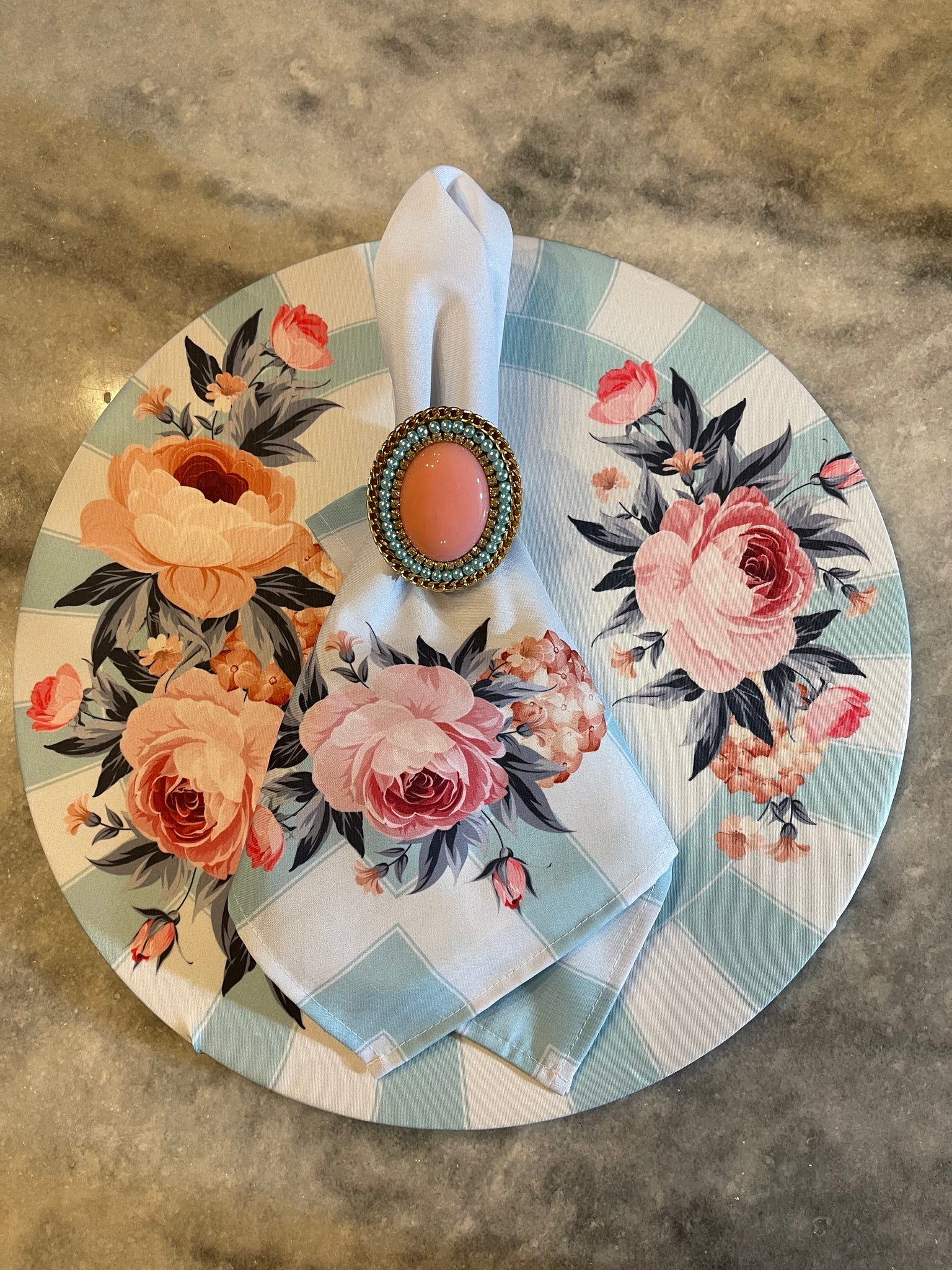Set contains: one sousplat cover, one napkin, and one napkin ring as per in the picture.