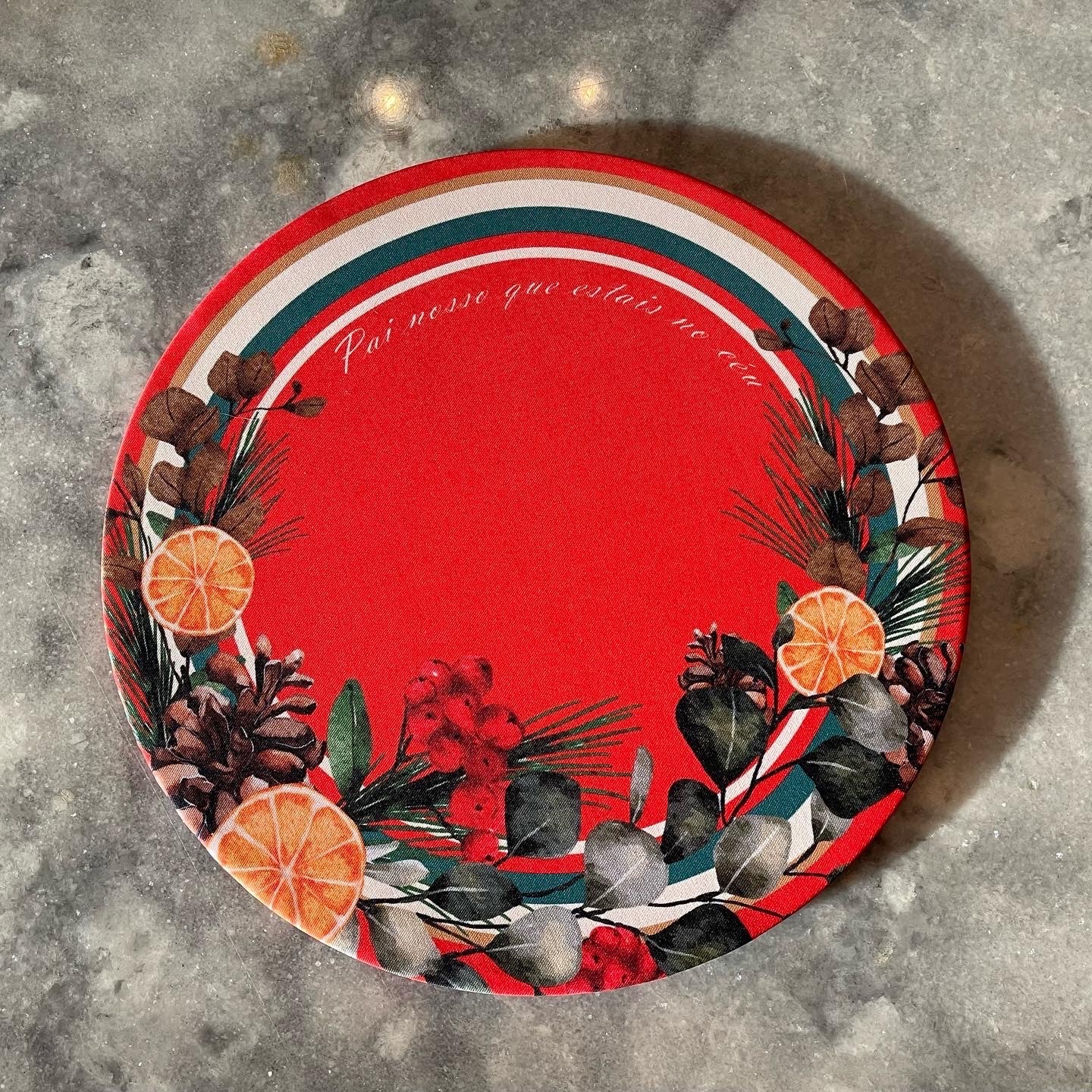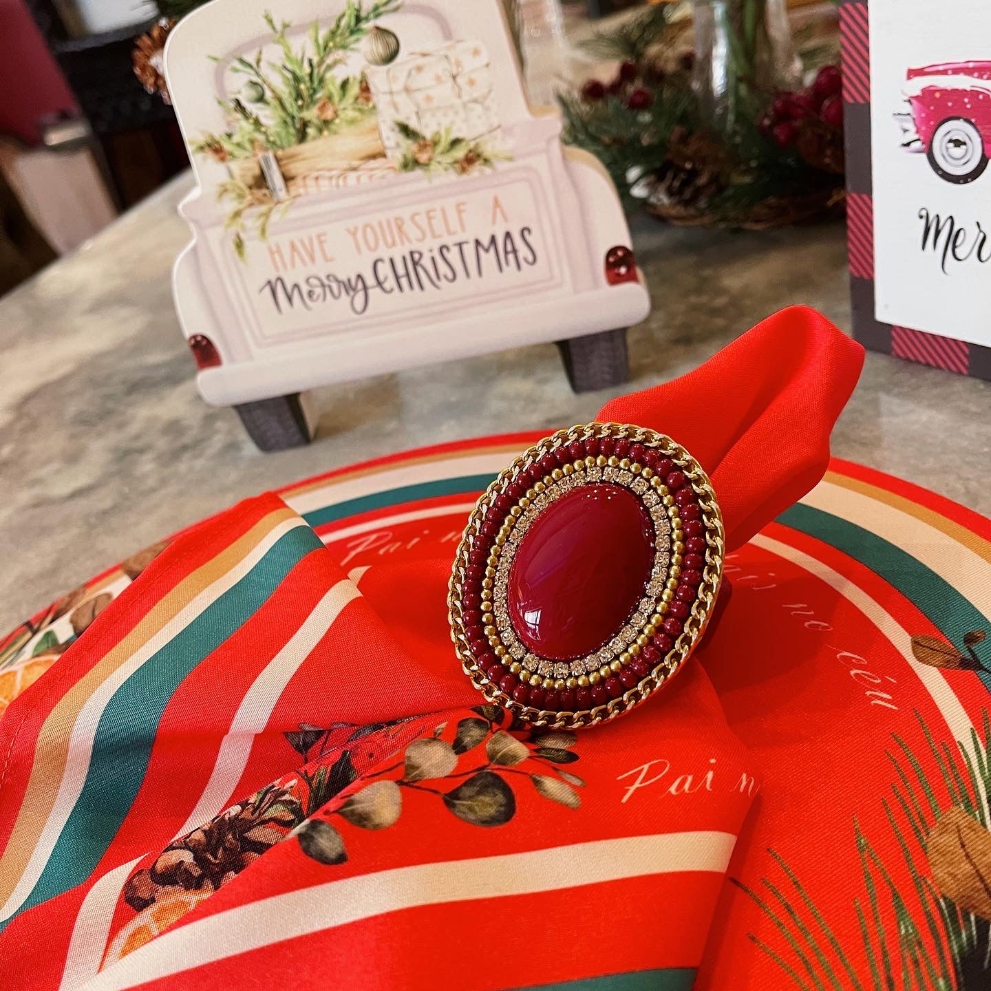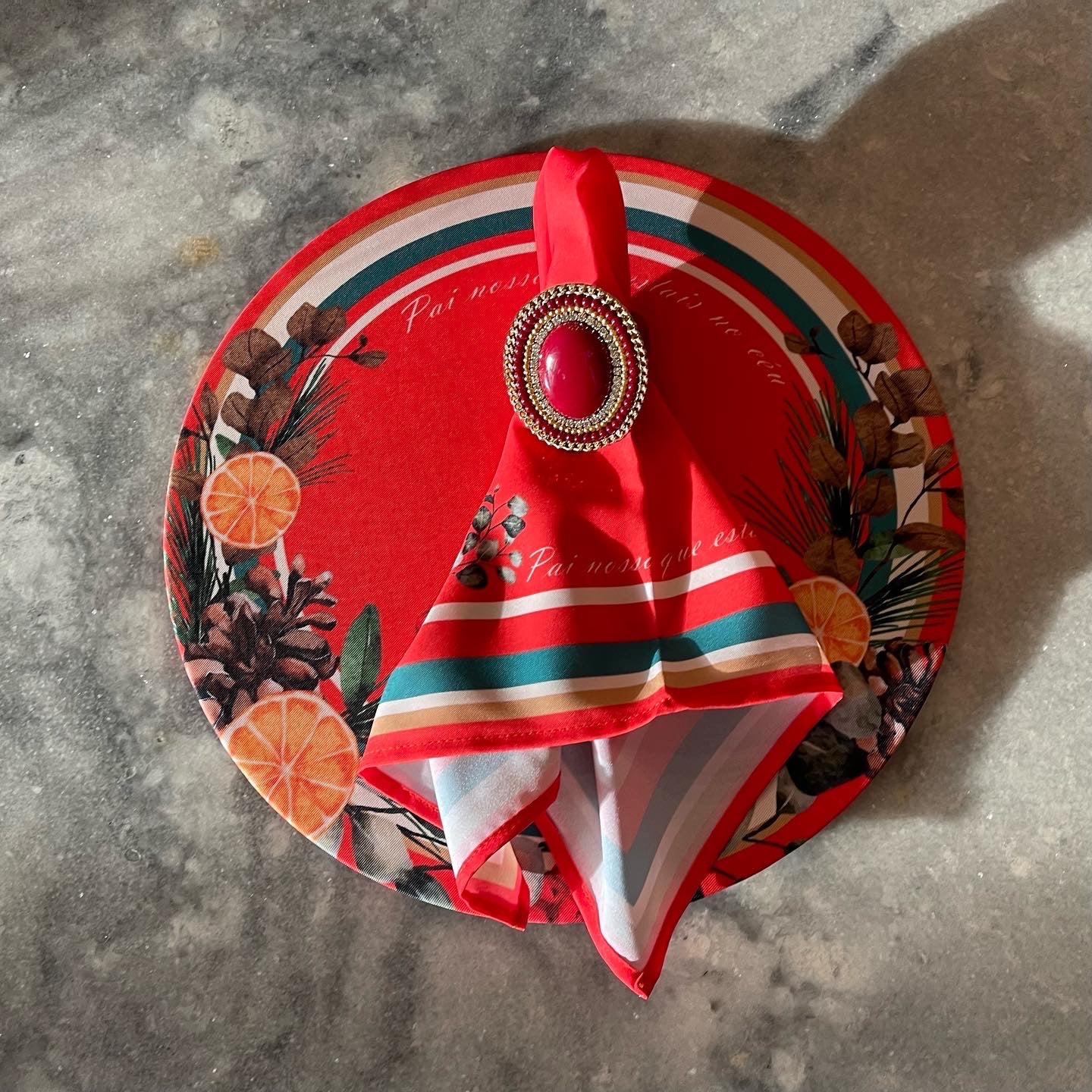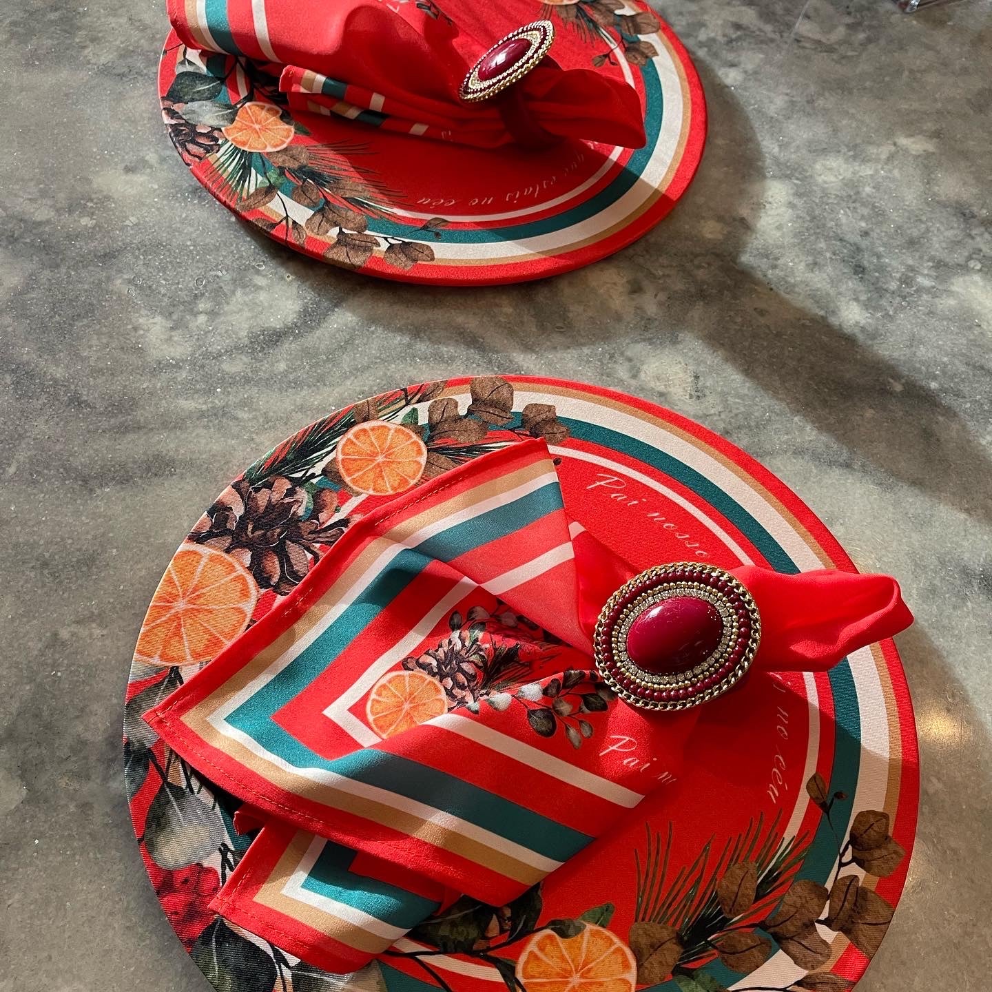 Set contains: one sousplat cover, one napkin, and one napkin ring as per in the picture.