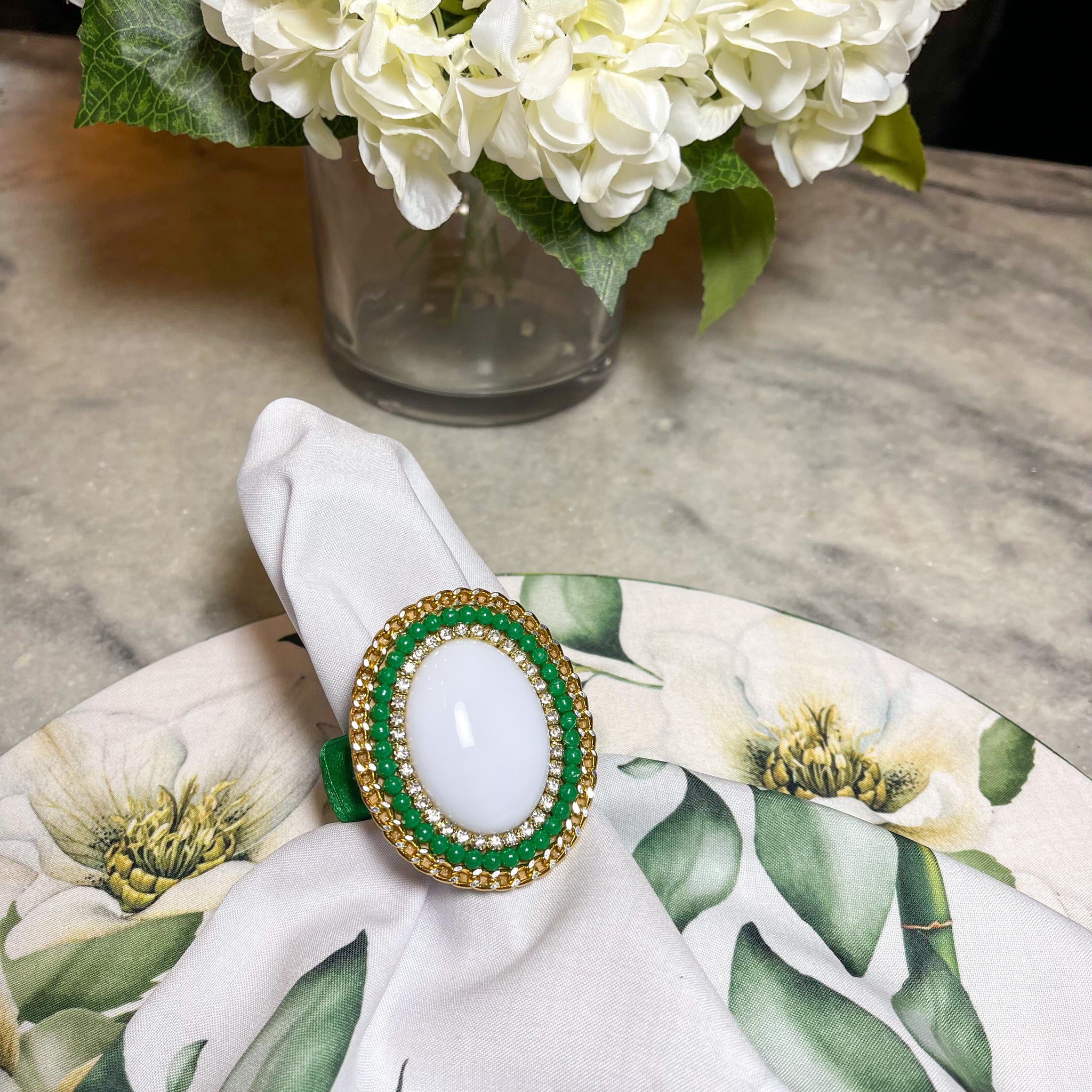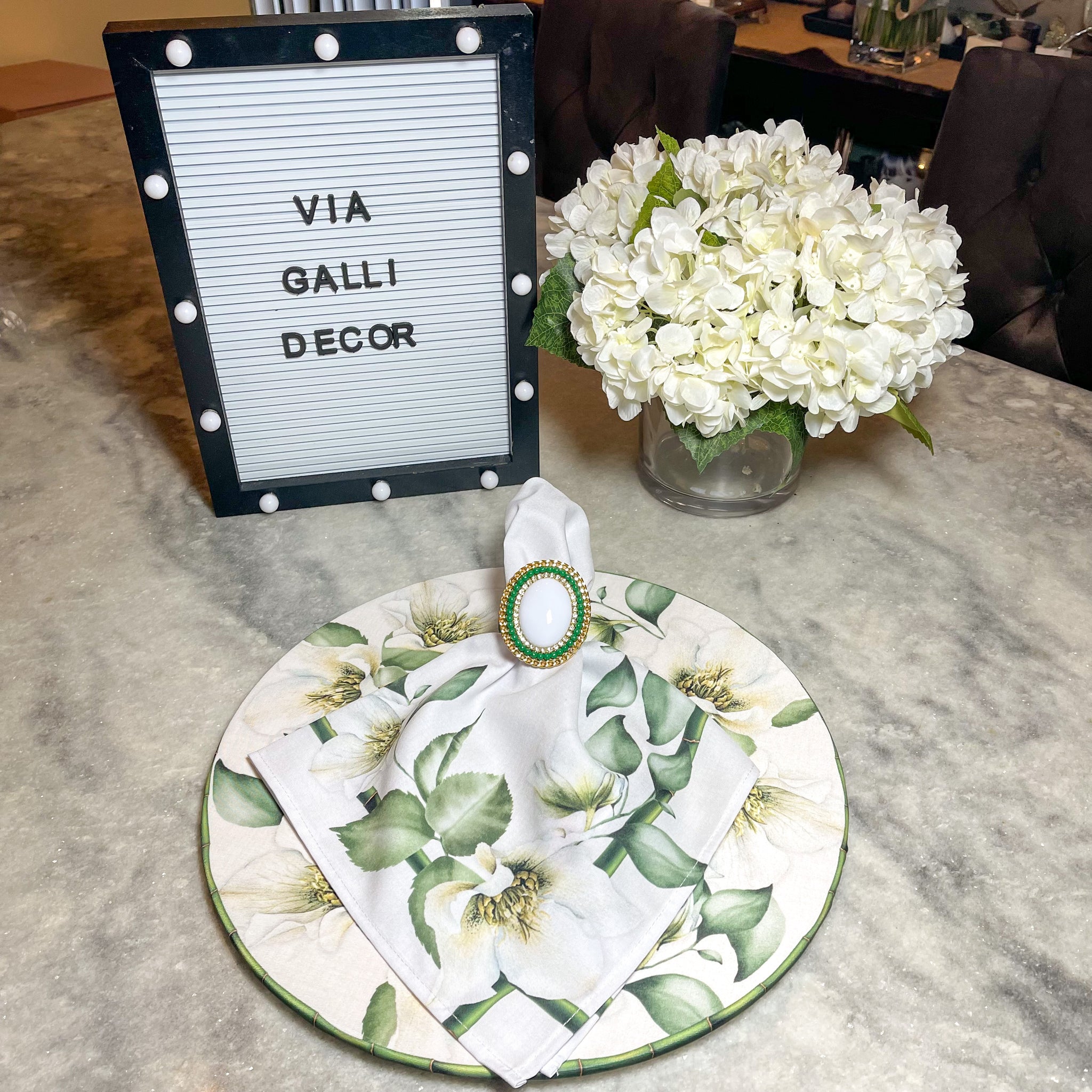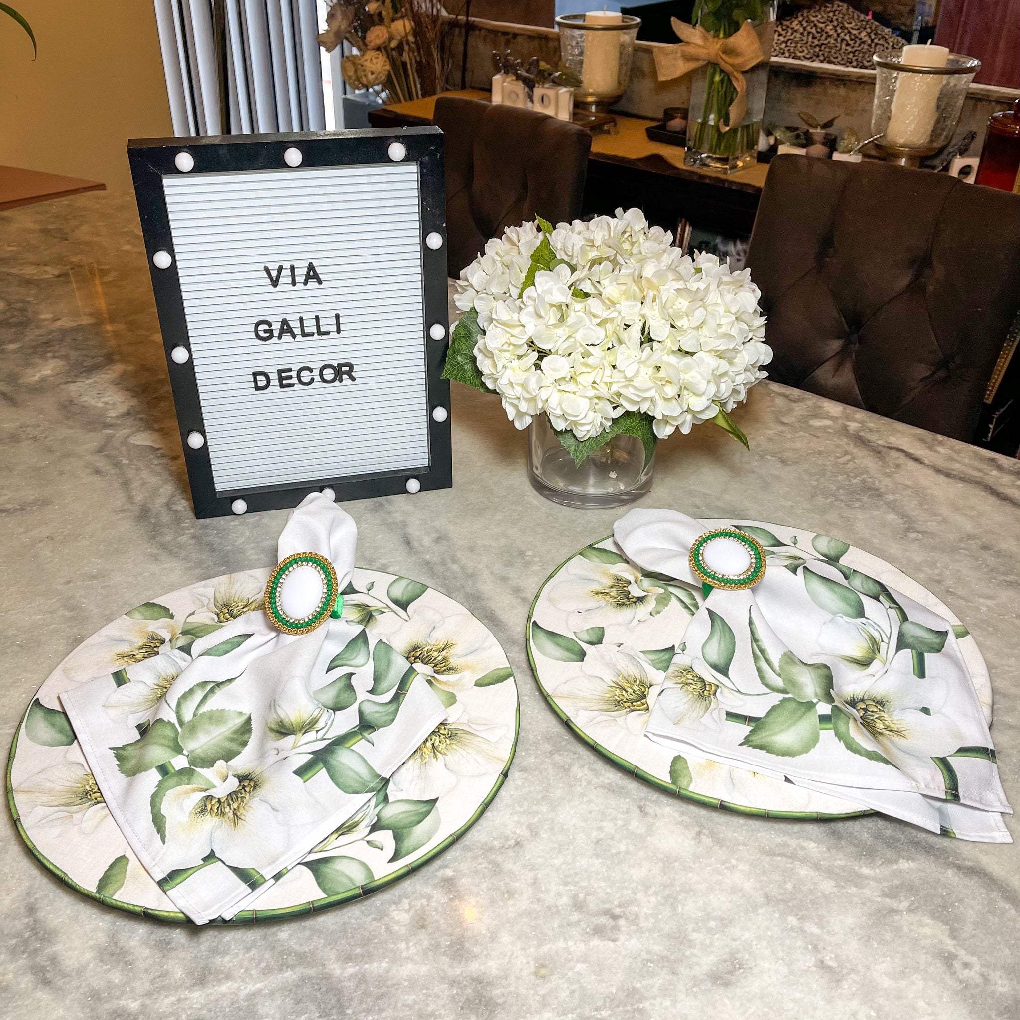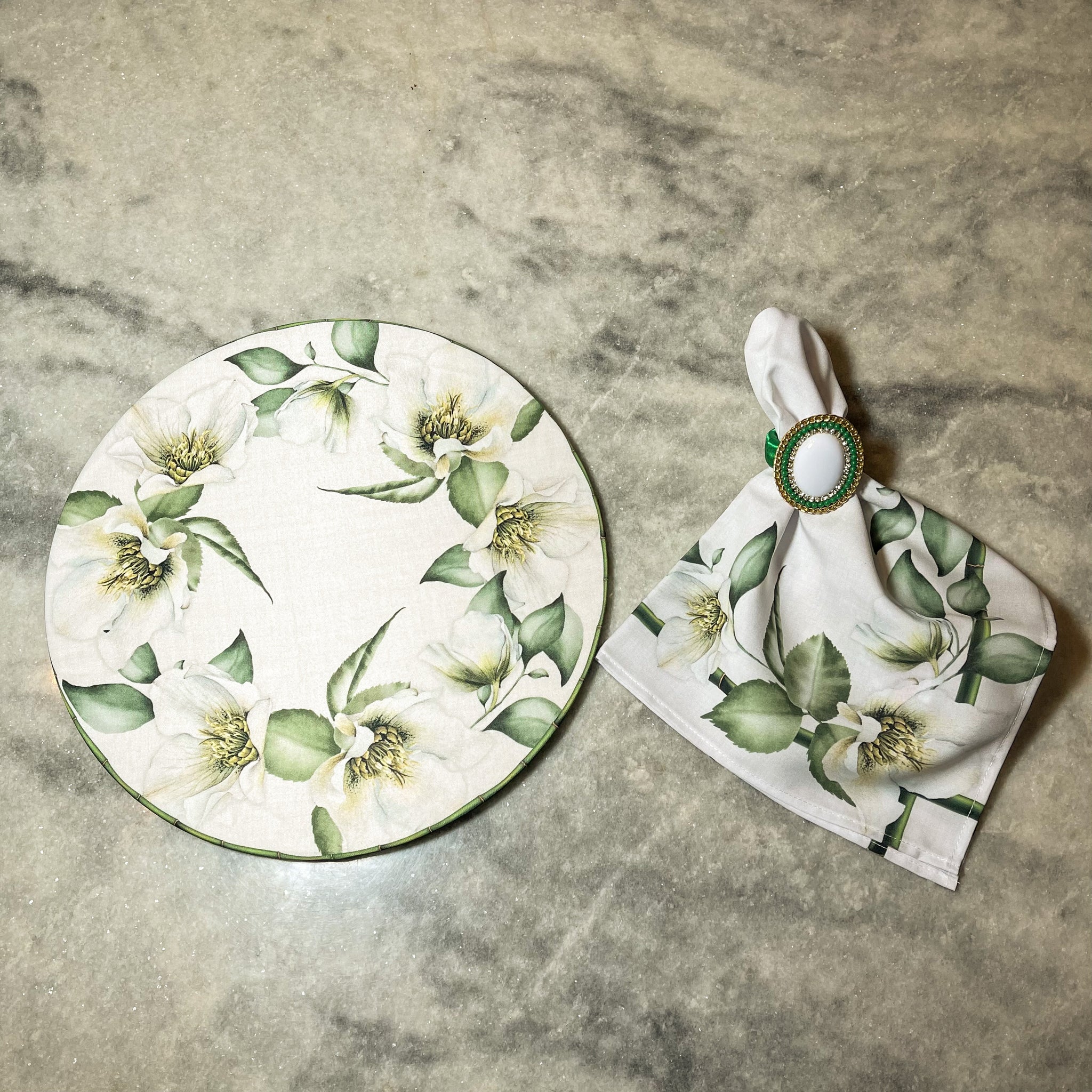 Set contains: one sousplat cover, one napkin, and one napkin ring as per in the picture.