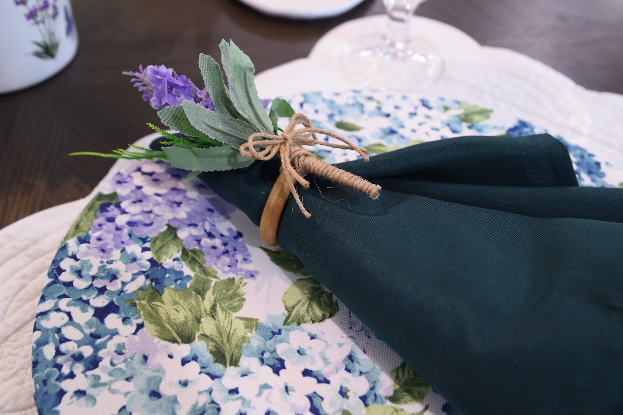 Set contains: one sousplat cover, one napkin, and one napkin ring as per in the picture.