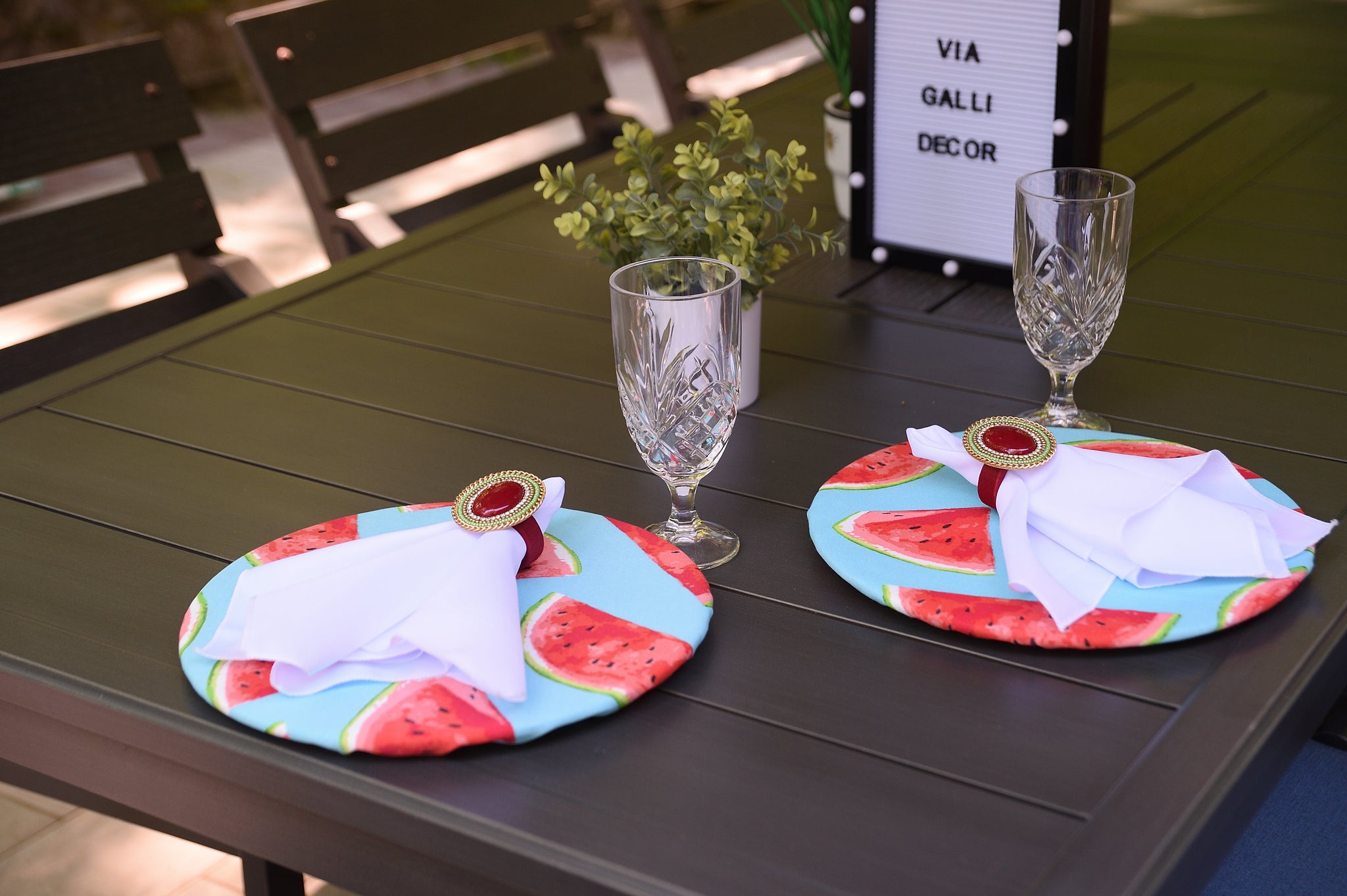 Set contains: one sousplat cover, one napkin, and one napkin ring as per in the picture.