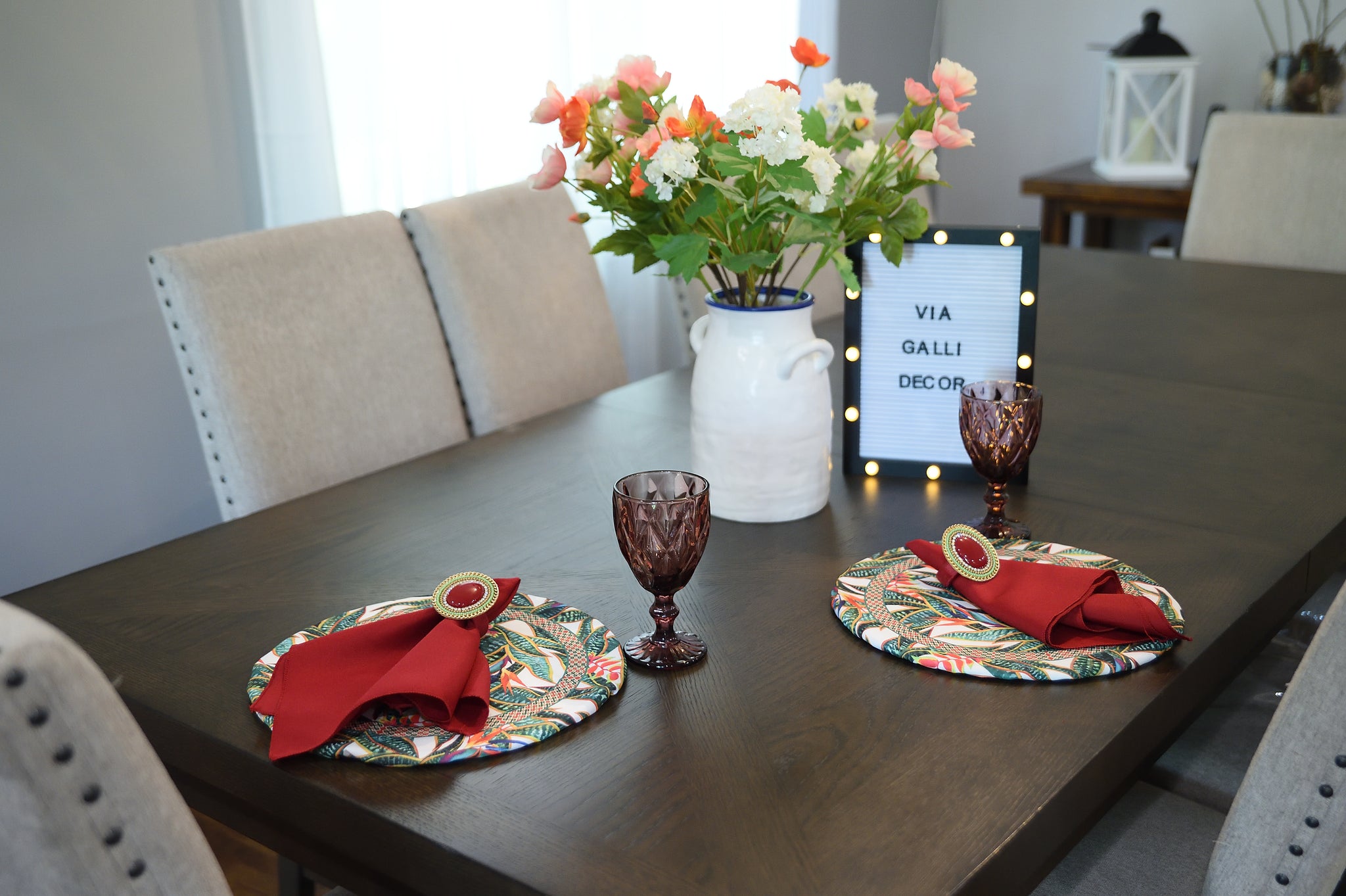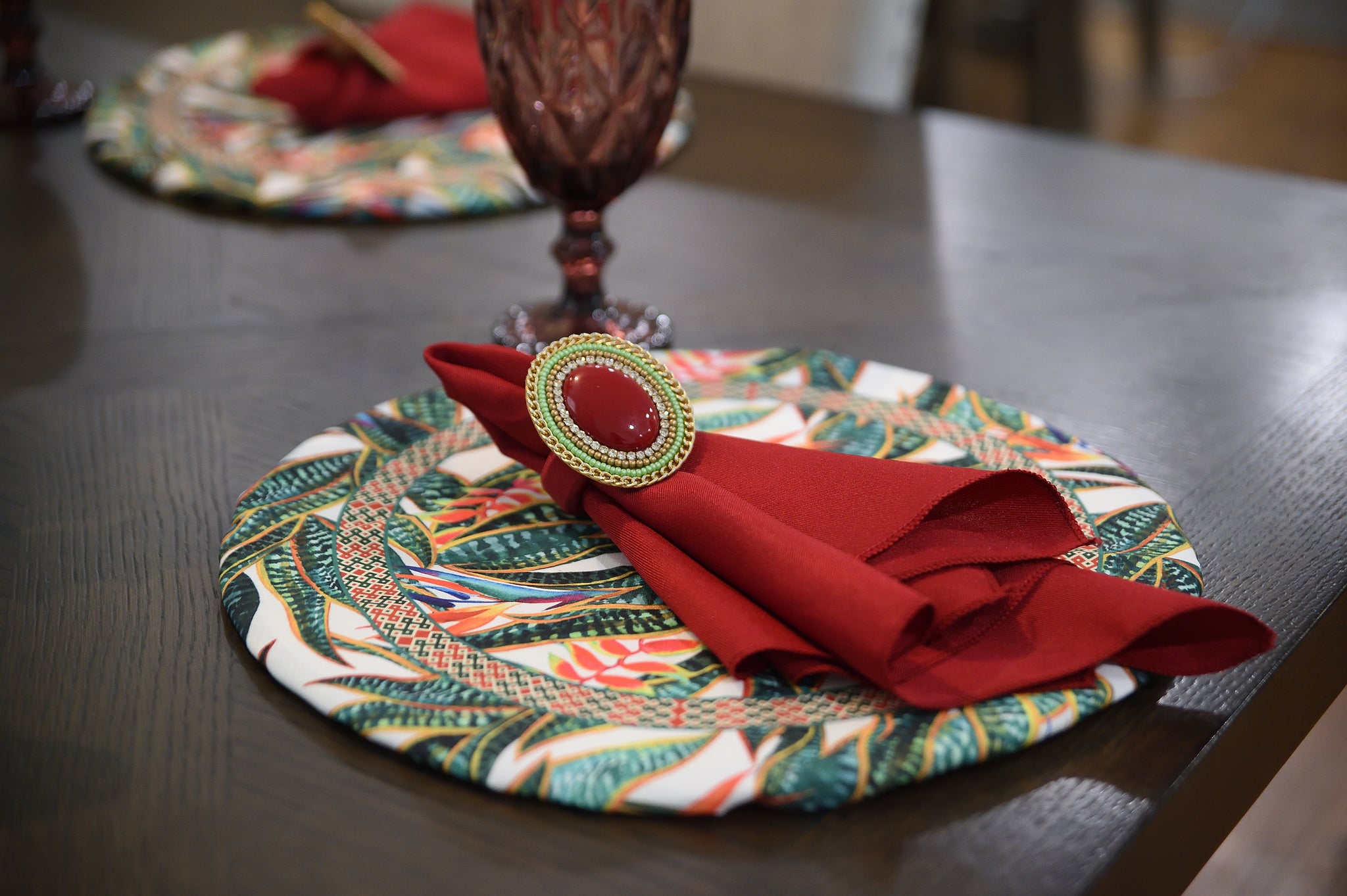 Set contains: one sousplat cover, one napkin, and one napkin ring as per in the picture.