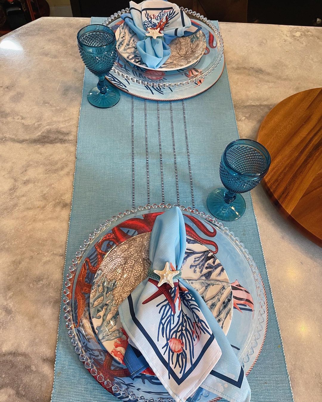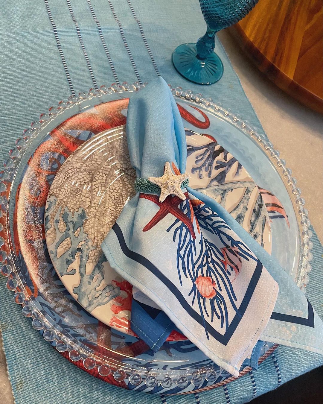 Set contains: one sousplat cover, one napkin, and one napkin ring as per in the picture.